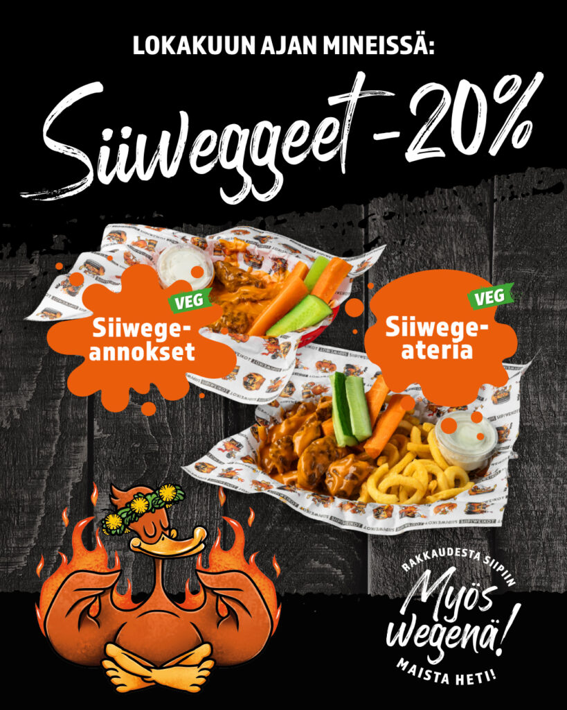 Siipiweikot Mini Kalevan buffetista löydät päivittäin medium-siivet, ristikkoperunat, sipulirenkaat, nugetit, viikoittain vaihtuvat tuunatut perunat (katso tuotteet alta), viikoittain vaihtuva spesiaalituote (katso tuotteet alta). Bonelessit tarjolla buffassa perjantaisin (+ aina normaalisti listatilauksena).