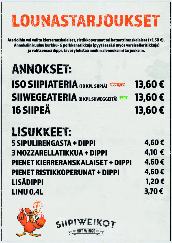 Muista myös Siipikestit-mahdollisuus yli 10 hengen porukoille!